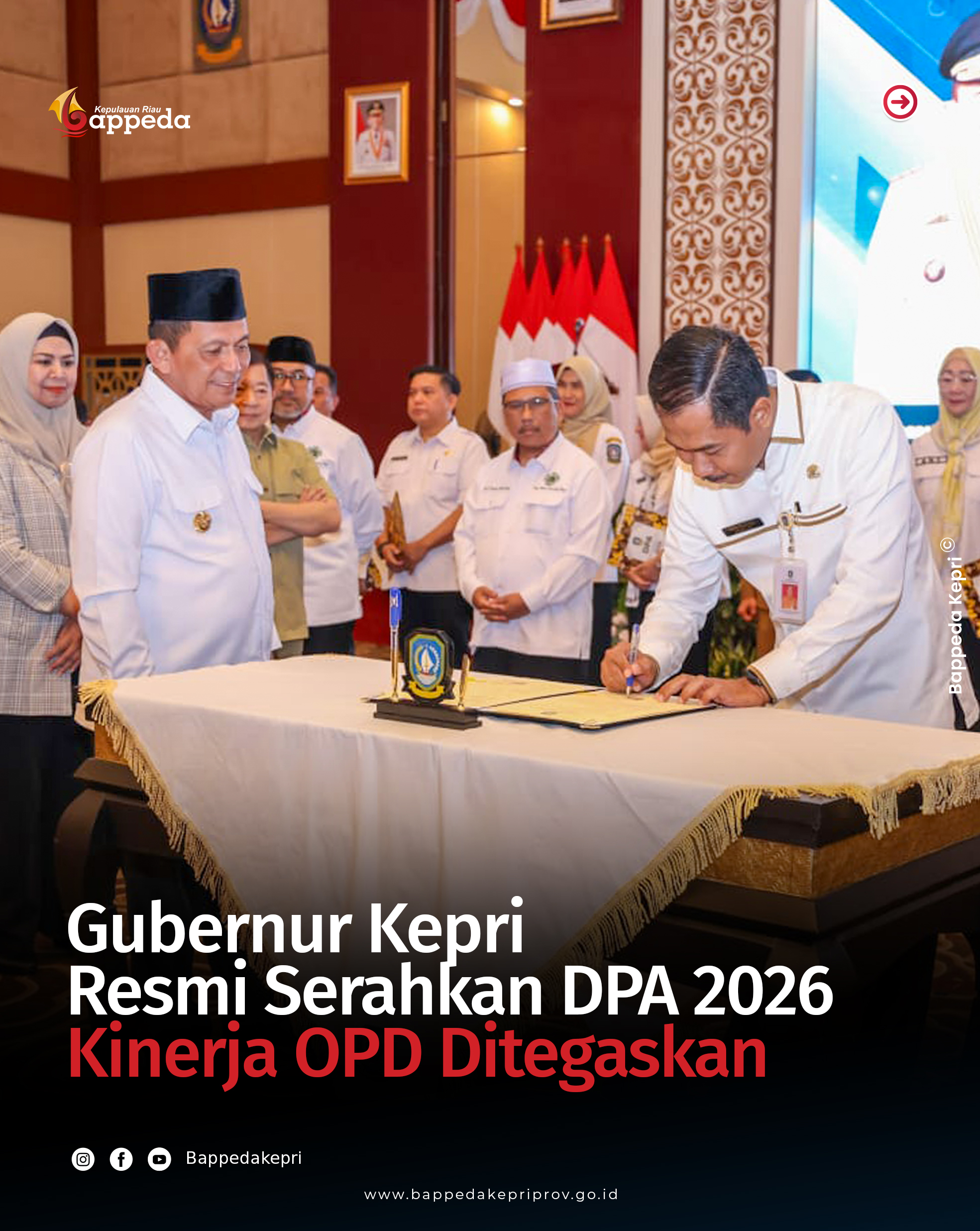 Tanjungpinang – Kepala Badan Perencanaan, Penelitian, dan Pengembangan Provinsi Kepulauan Riau, Dr. Aries Fhariandhi, S.Sos., M.Si, menerima Dokumen Pelaksanaan Anggaran (DPA) yang diserahkan secara langsung oleh Gubernur Kepulauan Riau, Ansar Ahmad, S.E., M.M, pada Selasa (13/1) di Aula Wan Seri Beni, Dompak, Tanjungpinang.